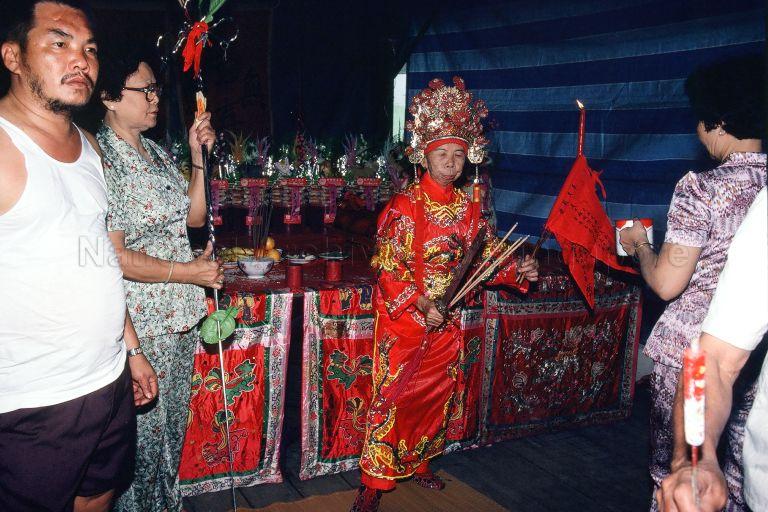 MEYAPPAR CHETTIAR ROAD TEMPLE - ENTRANCED FEMALE MEDIUM IN FRONT OF ALTAR AT A KAMPONG TEMPLE