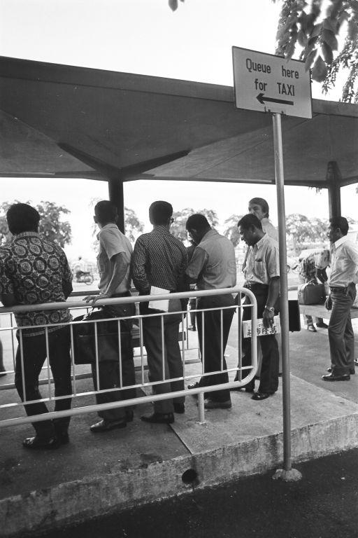 TAXI-STOP AT FULLERTON SQUARE. UNDER NEW REGULATIONS IMPLEMENTED ON 1 DEC 1974, TAXIS CAN ONLY PICK UP PASSENGERS AT THE SIX NEW TAXI-STOPS IN THE CITY AREA