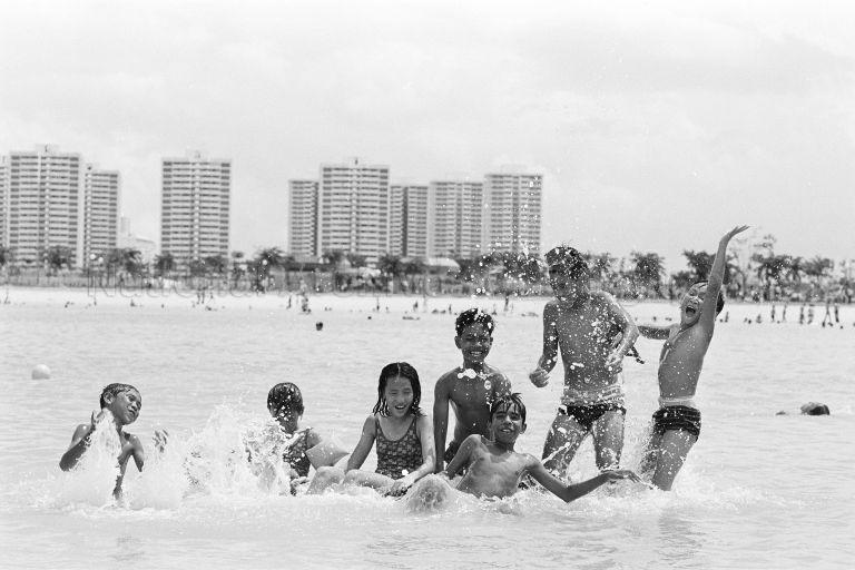CHILDREN AND ADULTS CAME TO THE OPENING OF THE GIANT LAGOON AT EAST COAST PARK. THE 6.1 HECTARE OVAL-SHAPED LAGOON IS SEPARATED IN TWO BY A BUND MARKING THE ADULTS AND CHILDREN'S SECTION. THERE ARE ALSO CHANGING ROOMS, LOCKERS, SHOWERS, TOILETS AND REFRESHMENT KIOSKS AT THE LAGOON