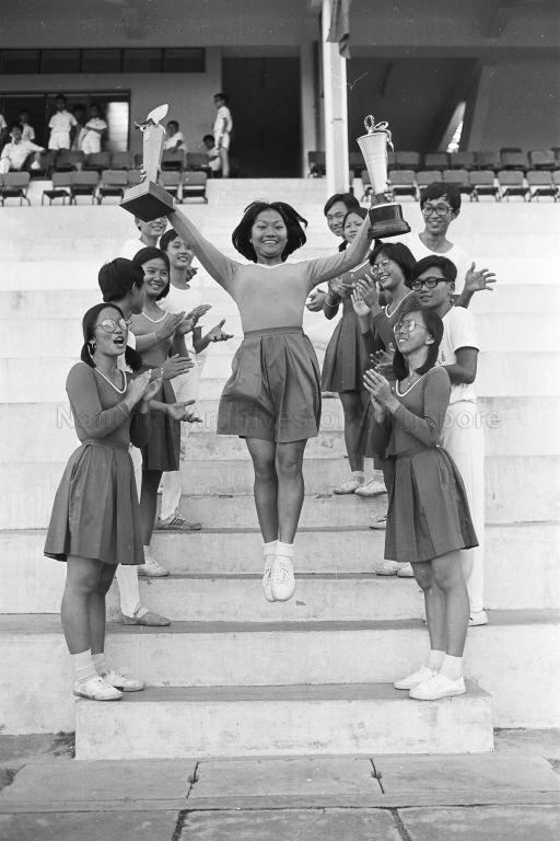CHAN KWAI CHEN FROM RAFFLES INSTITUTION JUMPING FOR JOY AFTER RECEIVING SPORTSWOMAN OF THE YEAR AWARD. THE TROPHIES WERE PRESENTED TO HER EARLIER BY WIFE OF MINISTER OF FOREIGN AFFAIRS MRS S RAJARATNAM IN CONJUNCTION WITH THE SCHOOL'S FOUNDER'S DAY