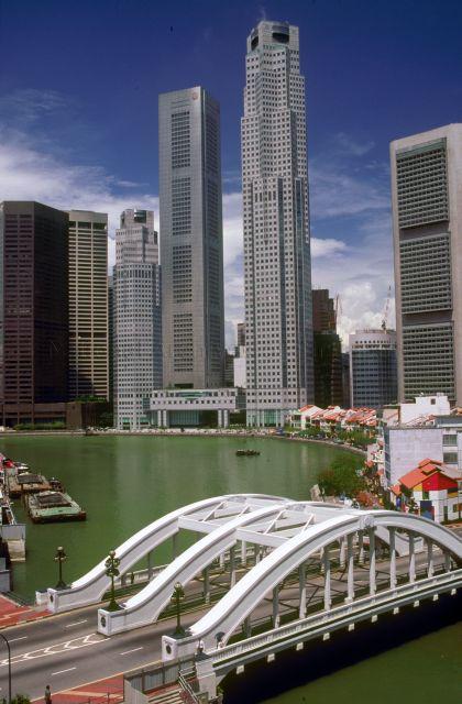 Elgin Bridge and Boat Quay with skyscrapers at Raffles Place