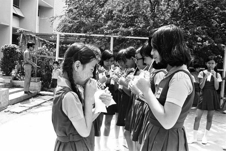 STUDENTS AT RIVER VALLEY PRIMARY SCHOOL DRINKING MILK UNDER THE MINISTRY OF EDUCATION'S SUBSIDISED DRINK-A-PINTA SCHEME FOR 27,000 PUPILS IN 34 GOVERNMENT PRIMARY SCHOOLS WHICH WAS A BIG HIT WITH THE CHILDREN