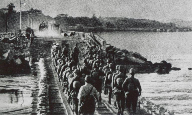 THE KONEO IMPERIAL GUARDS DIVISION OF THE JAPANESE ARMY UNDER LIEUTENANT-GENERAL NISHIMURA CROSSING THE JOHORE CAUSEWAY INTO SINGAPORE AFTER COMPLETING REPAIRS