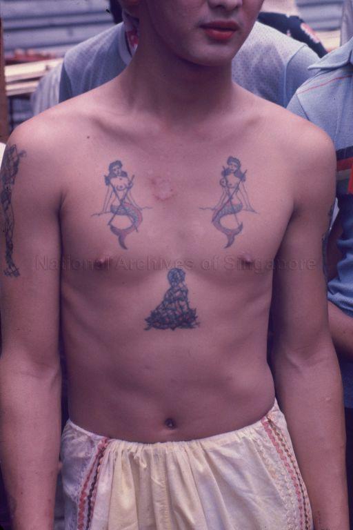 MEDIUM WITH TATTOOS CROSSED OUT ON HIS CHEST INDICATING THAT HE IS NO LONGER A MEMBER OF ANY SECRET SOCIETY