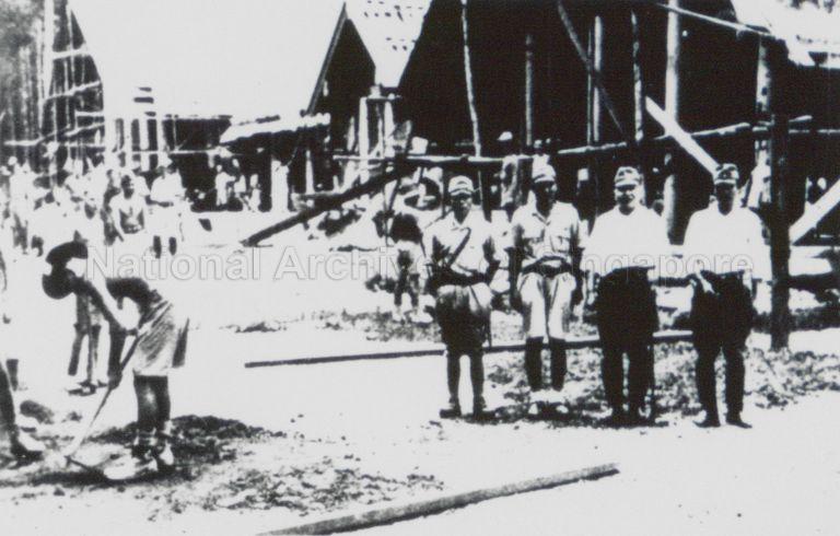 JAPANESE OCCUPATION OF SYONAN-TO - BUILDING OF THE SYONAN JINJYA SHRINE (OPENED ON 7TH DECEMBER 1942) AT MACRITCHIE RESERVOIR IN 1942 WITH JAPANESE INTERPRETER, MAJOR TSUGIZO HASHIMATO (SENIOR COMPANY COMMANDER, 5TH DIVISION ENGINEERS), COLONEL TAMURA AND TAMURA'S ORDERLY
