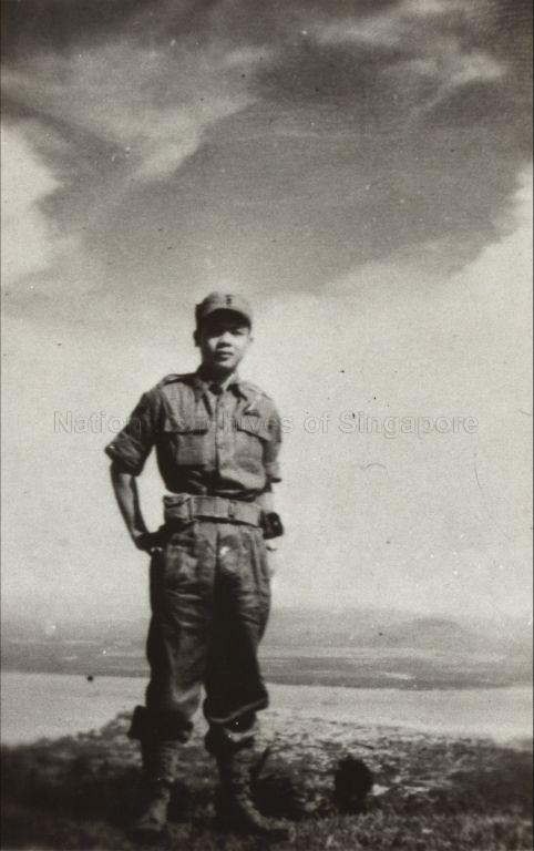 FORCE 136 MEMBER BRUCE CHIN FEN (CHEN BAO SHI) IN SOLDIER'S UNIFORM STANDING AGAINST THE HORIZON. DATED 1940S.