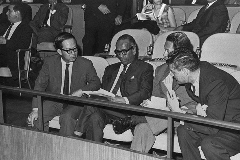 THE SINGAPORE GOODWILL MISSION TO UNITED NATIONS (UN) GENERAL ASSEMBLY AND AFRO-ASIAN COUNTRIES, LED BY DEPUTY PRIME MINISTER DR TOH CHIN CHYE (LEFT) WITH MINISTER FOR FOREIGN AFFAIRS S RAJARATNAM (SECOND LEFT), AT THE UN.