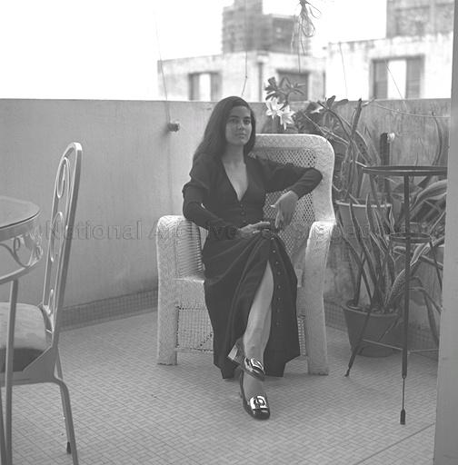 DENISE IN A LONG BLACK CREPE DRESS WITH A DEEP V-NECK. IMPORTED BY TREND, IT IS PRICED AT $160