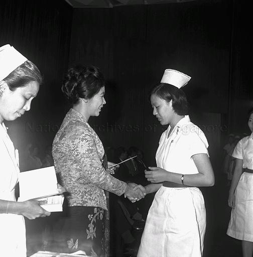 PUAN NOOR AISHAH, WIFE OF PRESIDENT YUSOF ISHAK, AT THE ANNUAL GRADUATION CEREMONY FOR 582 NURSES AND MIDWIVES AT THE SINGAPORE CONFERENCE HALL.