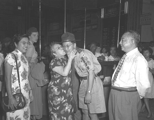 SCOUTS WITH FAMILY MEMBERS AT KALLANG AIRPORT BEFORE LEAVING FOR THE PAN-PACIFIC JAMBOREE THAT WOULD BE HELD IN AUSTRALIA.