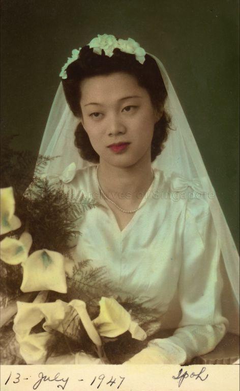MRS THAM SIEN YEN (NEE TAN TOH YEN) IN BRIDAL GOWN, TAKEN IN IPOH. MR AND MRS THAM SIEN YEN TOOK THEIR MARRIAGE VOWS IN IPOH'S CITY HALL ON 13 JULY 1947.