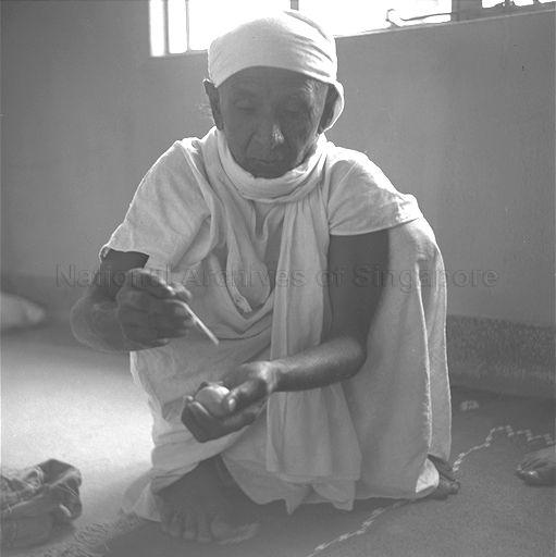HINDU YOGI SWAMI LILA SHAH MAHRAJ IS IN SINGAPORE TO FULFIL A VOW HE MADE 10 YEARS AGO TO CURE AT LEAST 120,000 PEOPLE OF ALL AILMENTS. IN THE PICTURE HE IS SEEN DEMONSTRATING A CURE FOR SHORT-SIGHTEDNESS USING A LEMON AND A SHAFT