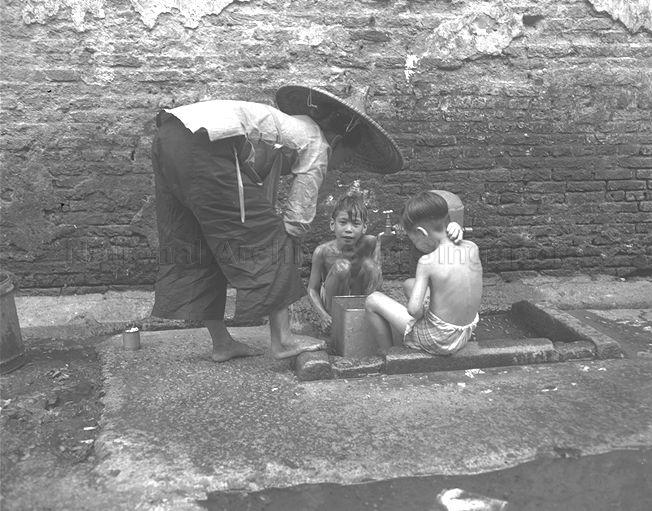 TWO BOYS USING THE STANDPIPE TO SHOWER THEMSELVES WHILE A LADY LOOKS ON