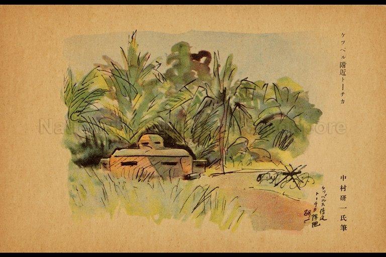 POSTCARD OF THE PAINTING TITLED "THE FORTIFICATION AT KEPPEL (NEAR KOTA BAHRU)", BY KEN'ICHI NAKAMURA, C.1942-1945