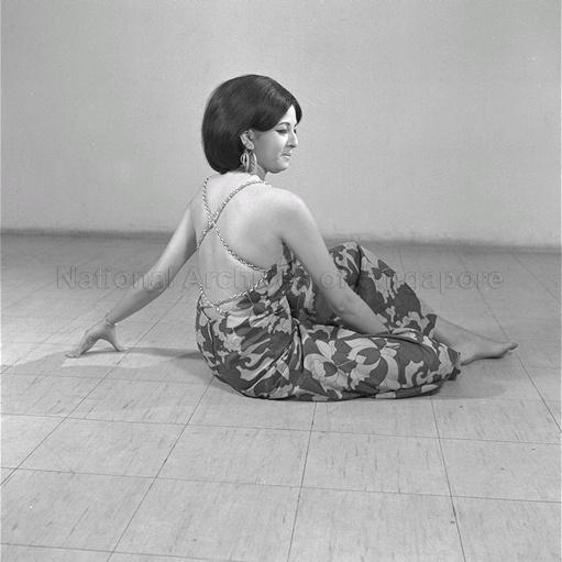 JEANETTE TAYE SHOWS OFF A PRINTED BARE-BACK OUTFIT WHERE THE STRAPS ARE HELD BY GOLD CHAINS CRISS CROSSED AT THE BACK.