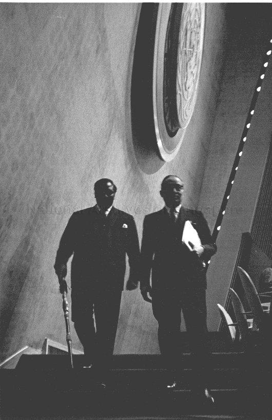 AMBASSADOR ALEX QUAISON-SACKEY OF GHANA, PRESIDENT OF THE GENERAL ASSEMBLY (LEFT), WITH UNITED NATIONS SECRETARY-GENERAL U THANT, AT THE CONCLUSION OF THE NINETEENTH SESSION, ADOPTING REPORT OF THE SPECIAL COMMITTEE ON PEACE-KEEPING OPERATIONS