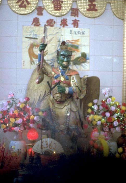 BUKIT BATOK THUNDER GOD TEMPLE - ALTAR TO THUNDER GOD "LUI KONG", HOLDING AN AXE IN HIS HAND. AT THE BOTTOM IS A CHINESE FAN INSCRIBED WITH FOUR LUCKY LOTTERY NUMBERS.