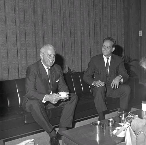 AUSTRALIAN PRIME MINISTER HAROLD HOLT (LEFT) AT THE SINGAPORE AIRPORT BEFORE LEAVING FOR PHNOM PENH AFTER A ONE-NIGHT STOPOVER. SENDING HIM OFF IS MINISTER FOR LAW E W BARKER.