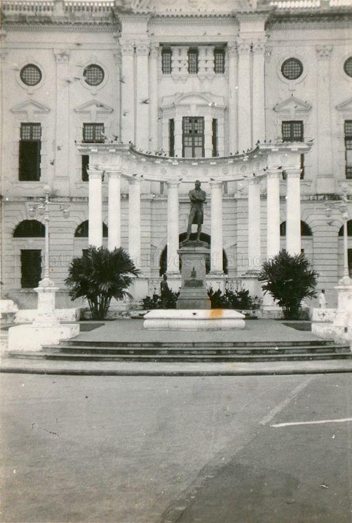 BRONZE STATUE OF SIR STAMFORD RAFFLES IN FRONT OF VICTORIA MEMORIAL HALL AND THEATRE, WITH A SEMI-CIRCULAR COLONNADE IN ITALIAN RENAISSANCE STYLE AND A POOL.. THE COLONNADE WAS DESTROYED AFTER THE FALL OF SINGAPORE