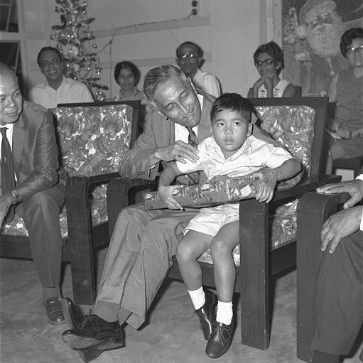 PRESIDENT YUSOF BIN ISHAK WITH YATIM BIN IBRAHIM, 5, ONE OF THE 50 CHILDREN AT THE TRAFALGAR HOME WHO ATTENDED A CHRISTMAS PARTY ORGANISED BY THE SINGAPORE LEPROSY RELIEF ASSOCIATION.