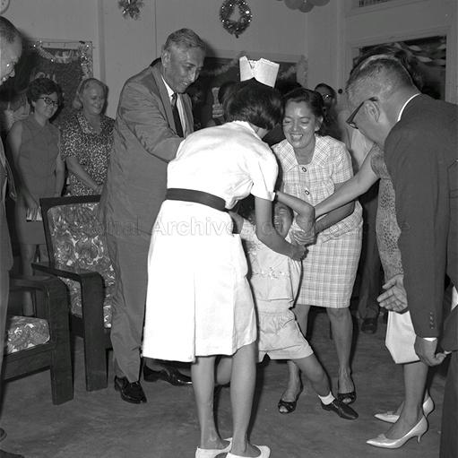 PRESIDENT YUSOF BIN ISHAK WITH YATIM BIN IBRAHIM, 5, ONE OF THE 50 CHILDREN AT THE TRAFALGAR HOME WHO ATTENDED A CHRISTMAS PARTY ORGANISED BY THE SINGAPORE LEPROSY RELIEF ASSOCIATION. WHEN THE PRESIDENT BADE FAREWELL, YATIM CRIED AND REFUSED TO BE LEFT BEHIND.