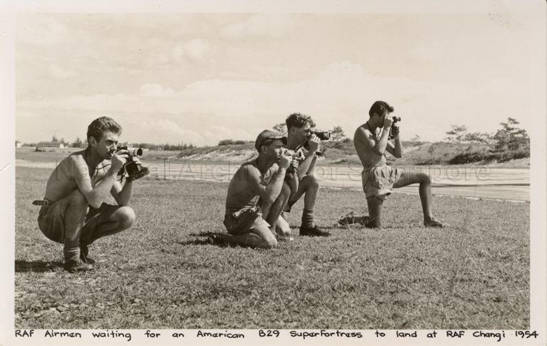 ROYAL AIR FORCE (RAF) AIRMEN WAITING FOR UNITED STATES AIR FORCE (USAF) B29 SUPER FORTRESS TO LAND AT ROYAL AIR FORCE (RAF) CHANGI