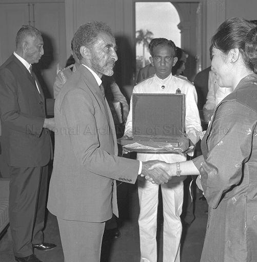 EMPEROR HAILE SELASSIE OF ETHIOPIA SHAKING HANDS WITH PUAN NOOR AISHAH (RIGHT), WIFE OF THE YANG DI-PERTUAN NEGARA YUSOF ISHAK (LEFT) AT THE ISTANA DURNG HIS FOUR-DAY STATE VISIT TO SINGAPORE.