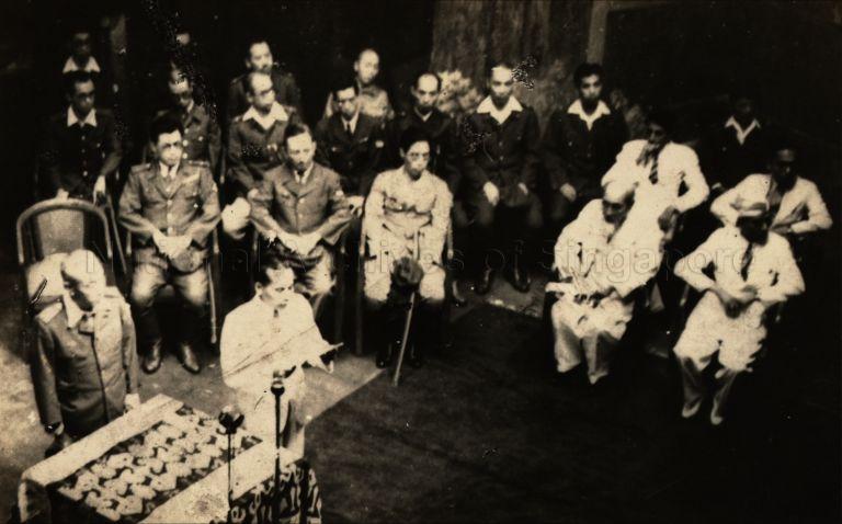 MEETING DURING THE JAPANESE OCCUPATION. DR LIM BOON KENG, LEADER OF THE OVERSEAS CHINESE ASSOCIATION IS SEATED IN THE FIRST ROW, SECOND FROM RIGHT. DATED 1942-1945.