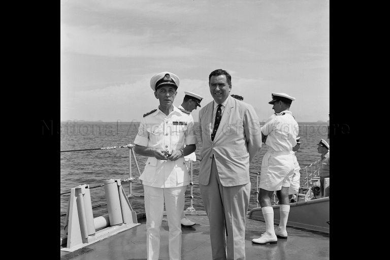 BRITISH SECRETARY OF STATE FOR DEFENCE DENIS HEALEY (RIGHT) AFTER SPENDING A DAY WITH FAR EAST FLEET AT SELETAR NAVAL BASE FOR FIRST-HAND STUDY OF ITS ROLE IN REGION ON BOARD AIRCRAFT CARRIER H.M.S. EAGLE IN SOUTH CHINA SEA