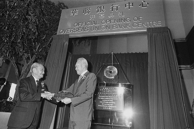 OVERSEAS UNION BANK (OUB) CHAIRMAN LIEN YING CHOW (LEFT) PRESENTING PRIME MINISTER LEE KUAN YEW WITH A PLAQUE AT OPENING CEREMONY OF OUB CENTRE