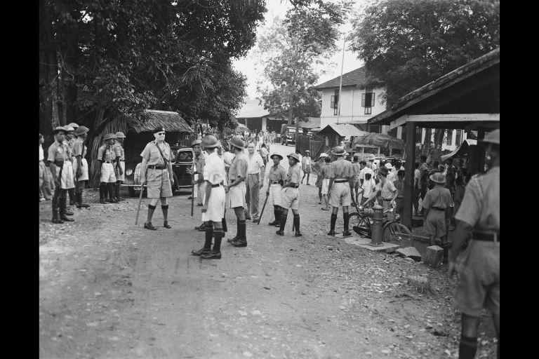 ANTI-RIOT POLICE, ARMED WITH WICKER SHIELDS, BATONS, STEEL HELMETS, AND ANTI-GAS RESPIRATORS, STANDING GUARD AT AIK HOE RUBBER FACTORY AFTER RUSHING THERE TO CORDON OFF AREA AND TO RADIO FOR REINFORCEMENT