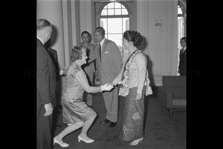 FIRST LADY OF VICTORIA, AUSTRALIA LADY BOLTE MAKES A CURTSY TO SINGAPORE'S FIRST LADY PUAN NOOR AISHAH DURING PREMIER OF VICTORIA, AUSTRALIA SIR HENRY BOLTE'S COURTESY CALL ON PRESIDENT YUSOF ISHAK