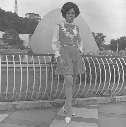 SELINA MODELS A PINAFORE IN LIME GREEN WITH WHITE TRIMMING TO MATCH THE WHITE LONG-SLEEVED BLOUSE.