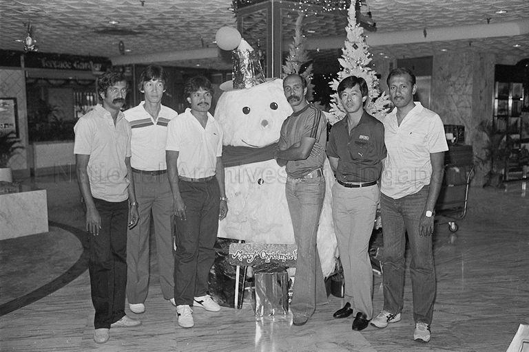 MALAYSIA EX-INTERNATIONALS (FROM LEFT) ISA BAKAR, CHOW CHEE KEONG, MOKHTAR DAHARI, ALI BAKAR, WONG CHOON WAH, M CHANDRAN POSING FOR PICTURES AT PRESIDENT MERLIN HOTEL BEFORE FOOTBALL MATCH AGAINST SINGAPORE FOR TUNKU ABDUL RAHMAN TROPHY AT NATIONAL STADIUM