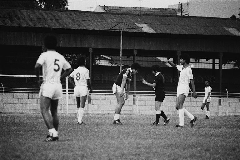 SINGAPORE BUSINESS HOUSES FOOTBALL LEAGUE (SBHFL) DIVISION TWO MATCH BETWEEN HILTON INTERNATIONAL AND GALAX MARINE AT JALAN BESAR STADIUM. HILTON INTERNATIONAL WON 3-1 WITH FEMALE REFEREE AZIMAH SAYAM (IN BLACK) POINTING OUT TO HILTON'S JAMIL AHMAD