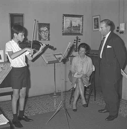 YOUNG VIOLINIST SEOW YIT KIN, 12, AND BRITISH VIOLINIST ROBERT MASTERS AT GOH SOON TIOE'S STUDIO AT BALMORAL CRESCENT. SEOW YIT KIN IS PREPARING TO LEAVE FOR LONDON TO JOIN THE YEHUDIN MENUHIN SCHOOL.