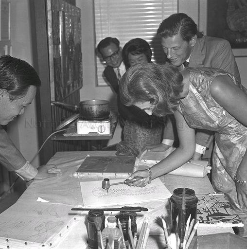 PRINCESS ALEXANDRA (RIGHT) VISITNG SEAH KIM JOO'S (LEFT) BATIK ART GALLERY AT 88 DEVONSHIRE ROAD AND TRIES HER HAND AT BATIK PAINTING WATCHED BY HER HUSBAND ANGUS OGILVY. THE PRINCESS IS QUEEN ELIZABETH'S REPRESENTATIVE TO SINGAPORE'S 150TH ANNIVERSARY CELEBRATIONS.