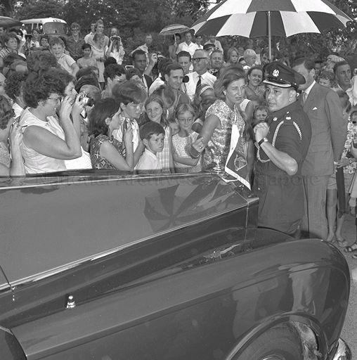 PRINCESS ALEXANDRA AND HER HUSBAND ANGUS OGILVY (PARTIALLY HIDDEN) VISITING SINGAPORE NAVAL BASE AT SELETAR. THE PRINCESS IS QUEEN ELIZABETH'S REPRESENTATIVE TO SINGAPORE'S 150TH ANNIVERSARY CELEBRATIONS.