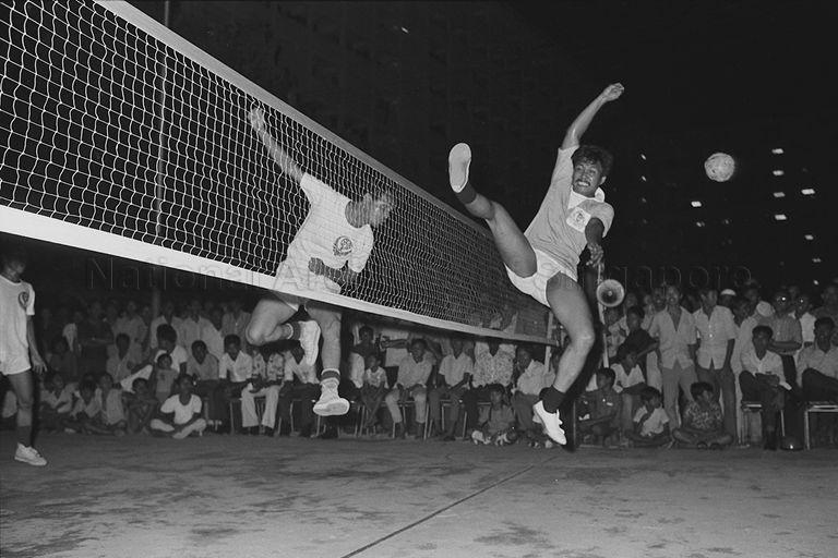 PERSES CUP SEPAK TAKRAW TOURNAMENT FINALS - POLICE SPORTS CLUB (SC) VERSUS GEYLANG SERAI SPECIAL CONSTABULATORY AT KAMPONG UBI SPORTS HALL. GEYLANG SERAI WON 3-0 WITH GEYLANG'S RAJA DIN (LEFT) HEADING PAST POLICE'S ALI MAS'OD