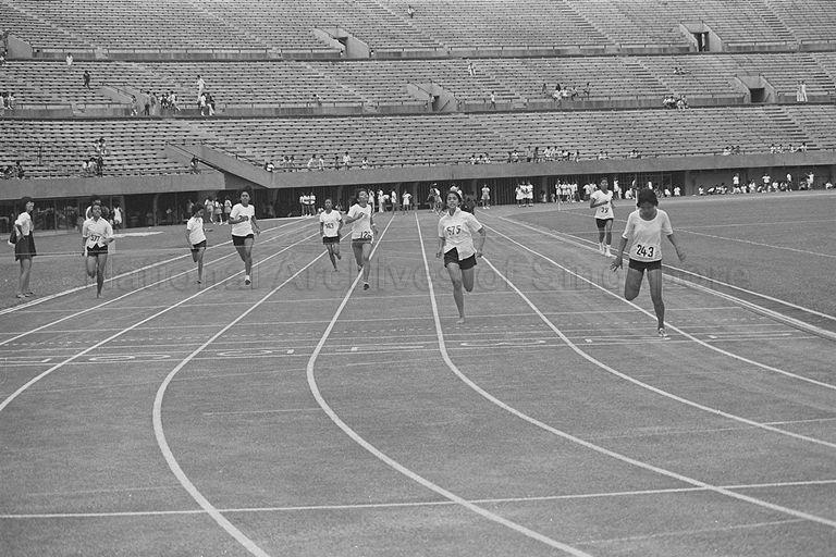 JUSIMARU ASMONI (NUMBER 243) WINNING 200 METERS FINALS IN RECORD 31.0 SECONDS WITH ZAINAB MASUWARI (NUMBER 575) BEHIND HER AT TUN SRI LANANG ATHLETIC MEET AT NATIONAL STADIUM