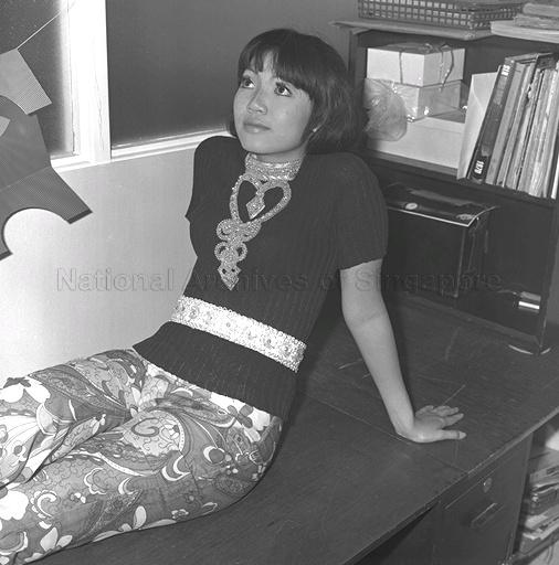 JOYCE CHEONG RUNS POLYMER INDUSTRIES, THE ONLY BEADWORK MANUFACTURER LISTED IN THE SINGAPORE MANUFACTURER'S ASSOCIATION'S LIST. SEEN HERE IS GRACE WHO IS MODELLING A WHITE BEAD SNAP-ON COLLAR WITH MATCHING BELT.