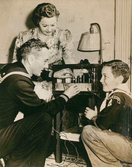 RADIOMAN J HAROLD HARVESTON TELLING HIS WIFE AND SON HOW HE BUILT THE SECRET RADIO IN THE JAPANESE PRISON CAMP AT CABANATUAN, PHILIPPINES, 1939-1945