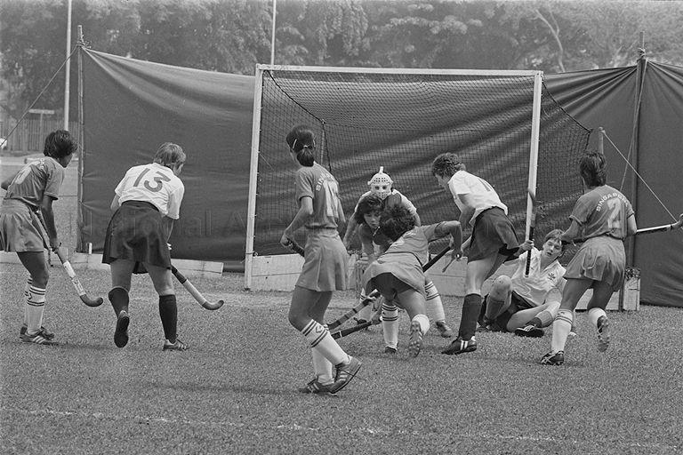 FEMALE HOCKEY MATCH BETWEEN SINGAPORE NATIONAL TEAM AND WALES AT SINGAPORE CRICKET CLUB (SCC), PADANG. MATCH ENDED 2-2 WITH WALES'S SHIRLEY MORGAN GETTING SQUEEZED OUT BY RUBY TAN (BACK TO CAMERA) AND THERESA DORALL IN GOALMOUTH MELEE