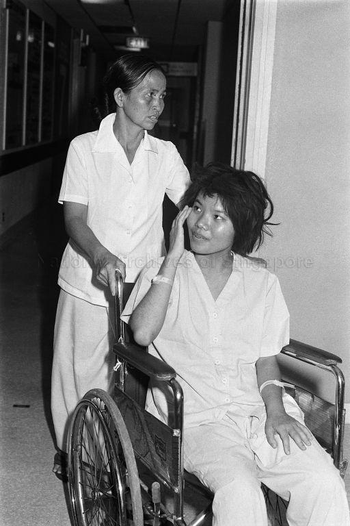 A SURVIVOR OF COLLAPSED SIX-STOREY HOTEL NEW WORLD IN SERANGOON, BEING WHEELED TO HER WARD IN HOSPITAL