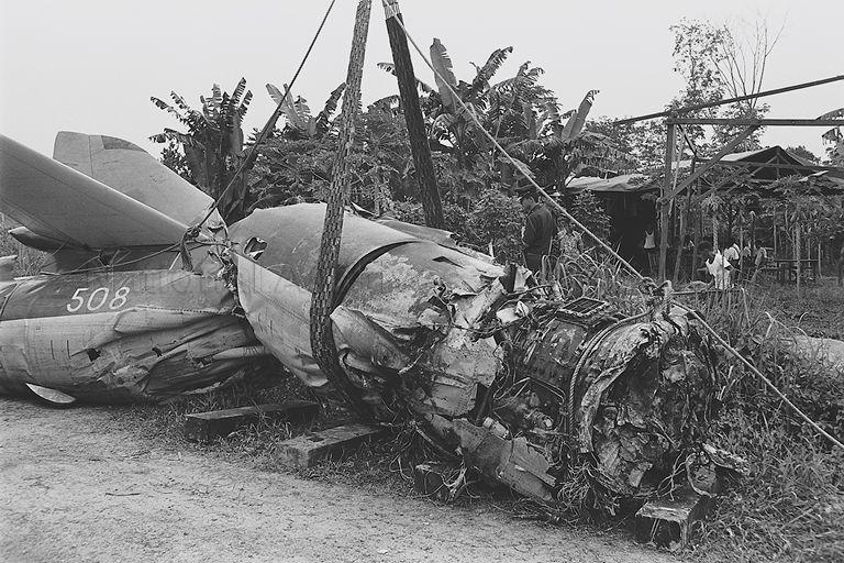 WRECKAGE OF SINGAPORE AIR DEFENCE COMMAND HUNTER JET AFTER CRASHING INTO A VEGETABLE FARM IN JALAN MURAI, OFF LIM CHU KANG ROAD. PILOT EJECTED SAFELY WHILE FARMER ANG YEW TECK WAS INJURED BY SPLINTER IN A FARM TOILET AND DIED DESPITE BEING AIRLIFTED IMMEDIATELY TO OUTRAM HOSPITAL