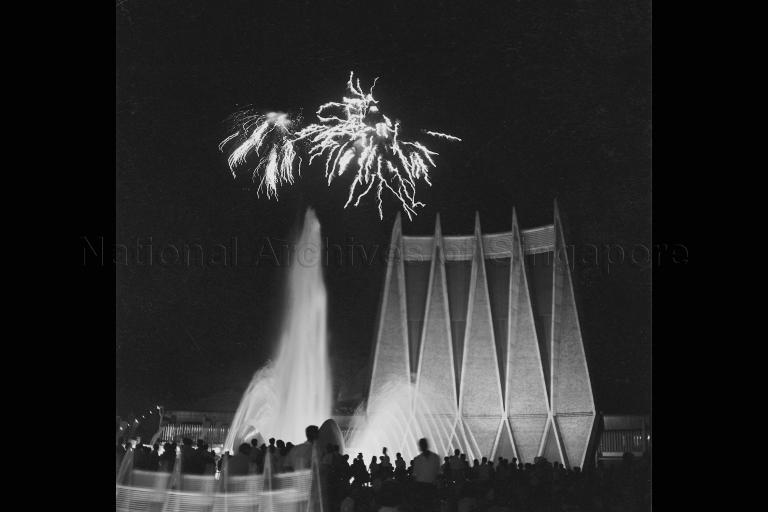 FIREWORKS DISPLAY AT NATIONAL THEATRE, AS PART OF A WEEK-LONG CELEBRATION MARKING FIRST ANNIVERSARY OF SINGAPORE'S INDEPENDENCE