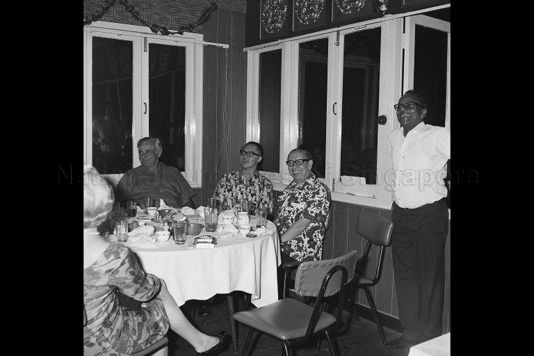 EDITOR-IN-CHIEF OF STRAITS TIMES GROUP SINCE 1956, TAN SRI LESLIE C HOFFMAN (SECOND FROM RIGHT) RETIRING AFTER SPENDING HIS ENTIRE WORKING LIFE IN MALAY TRIBUNE BEFORE WORLD WAR TWO AND STRAITS TIME AFTER THE WAR, AT A DINNER PARTY GIVEN BY STRAITS TIMES EDITORIAL STAFF AT PARADISE RESTAURANT. BORN AND EDUCATED IN SINGAPORE, HE WAS INTERNED IN A PRISON CELL DURING THE WAR