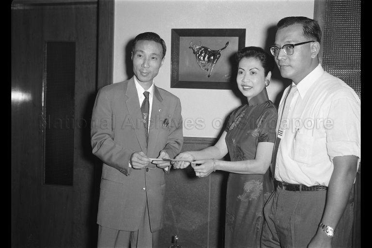MADAM BETTY SEOW GUAT BENG WHO IS WIFE OF 1957 SINGAPORE'S MERDEKA MISSION TO LONDON LIM KOON TECK, HANDING A CHEQUE TO VICE-CHAIRMAN OF INTERNATIONAL CHARITIES COMMITTEE RUN RUN SHAW (LEFT)