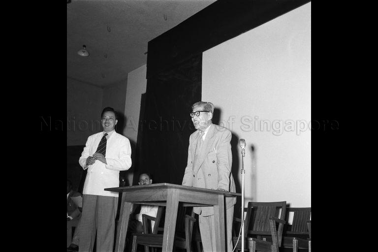 FOUNDER OF LEE FOUNDATION LEE KONG CHIAN (RIGHT) WAS ELECTED CHAIRMAN OF INTERIM COMMITTEE OF NEWLY-FORMED SINGAPORE COUNCIL OF SOCIAL SERVICE WHICH WILL REPLACE SOCIAL WELFARE COUNCIL ESTABLISHED IN 1946, WITH MEMBERS APPOINTED BY GOVERNOR, UNTIL ITS CONSTITUTION IS APPROVED, AT ASIAN SEAMEN'S HOSTEL