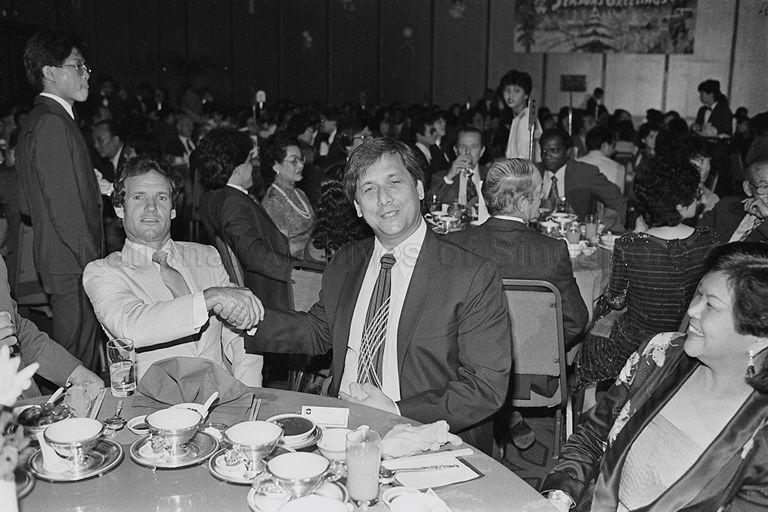 JOCKEY ALWIN TWEEDIE (SEATED, LEFT) AND TRAINER IVAN ALLAN (SEATED, CENTER) EXCHANGING HANDSHAKES AT GALA DINNER AND AWARD PRESENTATION CEREMONY OF 50TH ANNIVERSARY OF BUKIT TIMAH RACECOURSE AT SHANGRI-LA HOTEL